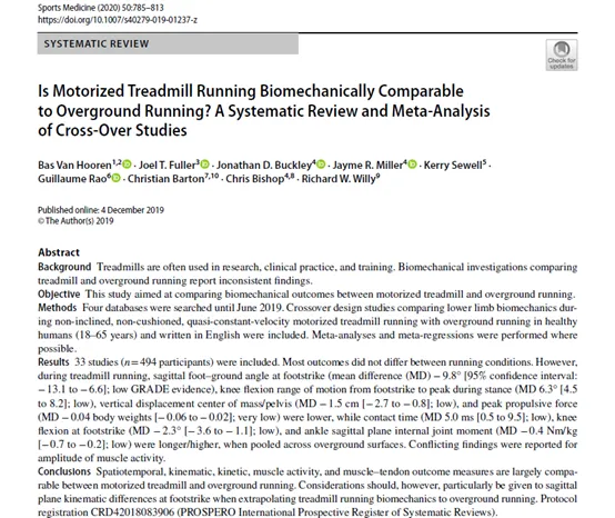 发表了国际顶级运动科学杂志《Sports Medicine》上2020年的一篇综述《Is Motorized Treadmill Running Biomechanically Comparable to Overground Running? A Systematic Review and Meta-Analysis of Cross-Over Studies》(跑步机跑步与地面跑步在生物力学上具有可比性吗?系统回顾和荟萃分析),经过大量文献综述,最终的结论也是跑步机跑步与地面跑步在多数生物力学测量上没有显著差异。跑步机上跑步身体重心上下起伏更小,这可能与跑步机跑步时的步频较高有关。而快步频小步幅的优势前文已经充分说明——就是减少腾空高度,从而减少着地冲击,所以从减少着地冲击,从而减少伤痛发生角度而言,跑步机上跑步反而是室外跑步具有更潜在的好处。