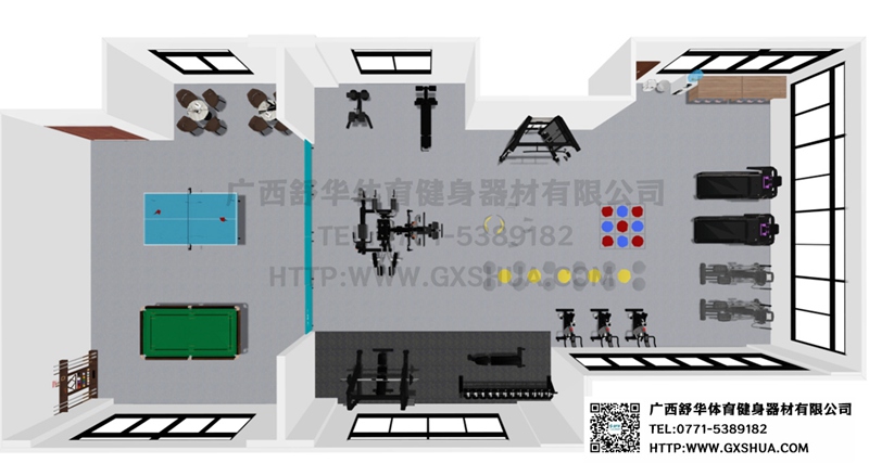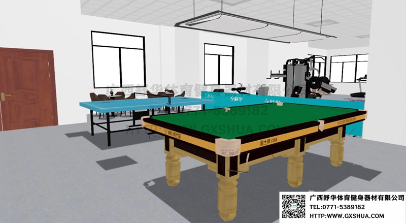 12.台球桌*1张-单位健身房配置台球桌,为员工的业余生活增添了乐趣和选择。与传统的健身器材锻炼相比,台球具有更强的娱乐性和趣味性,能够吸引更多员工参与到健身活动中来,提高健身房的使用率,让员工在工作之余有更多放松身心的方式。